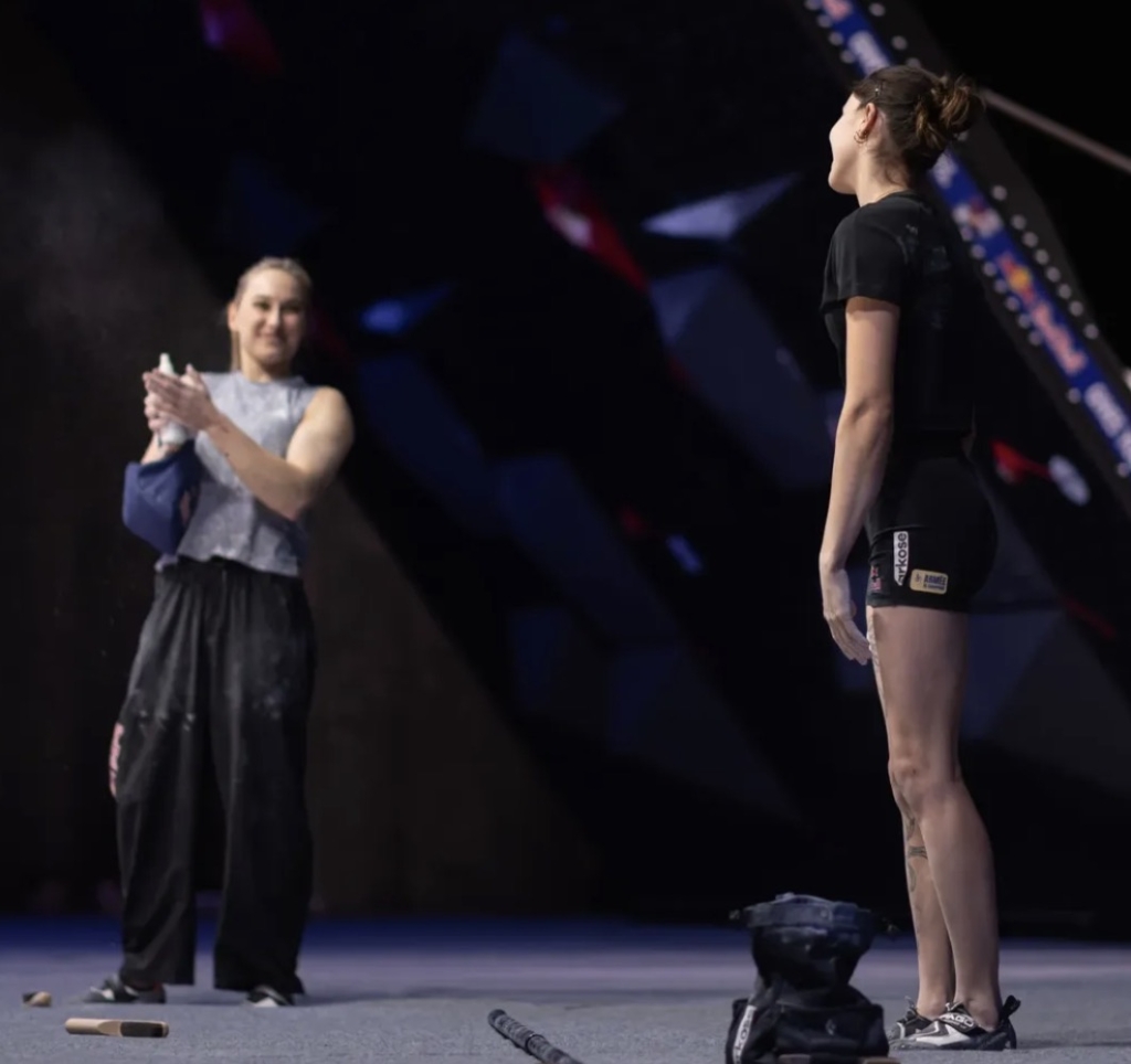 Au moment du duel final des femmes de la PCL, la salle s’assombrit. Oriane Bertone et Janja Garnbret entrent enfin sur scène sous un tonnerre d’applaudissements, et après une rapide présentation, arrive la minute de lecture. Presque naturellement, elles échangent quelques mots et décrypte le bloc ensemble, comme des coéquipières, et non plus comme des adversaires (ce constat était d’ailleurs fait sur la quasi totalité des duels, hommes et femmes confondus).