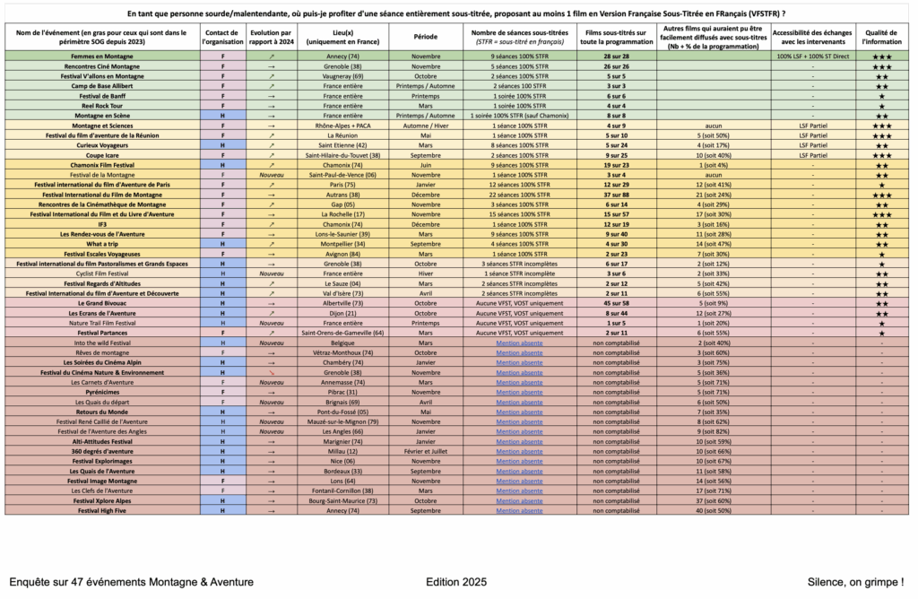 Le collectif que l’on n’arrête plus, Silence, On grimpe ! vient de publier son enquête annuelle sur l’accessibilité des événements de films de Montagne et d’Aventure pour les personnes sourdes et malentendantes. Et les nouvelles sont très encourageantes puisque le travail de sensibilisation de ces bénévoles porte ses fruits avec plus de 62% de festivals mentionnant des sous-titres contre 46% en 2024. Une nette augmentation qui pourtant doit être relativisée. À vous de découvrir si votre festival préféré est un bon élève.