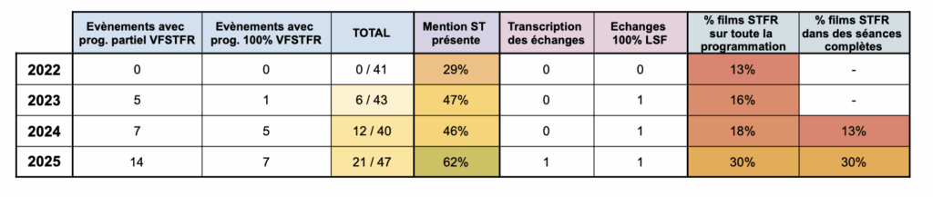 Bien que le collectif œuvre depuis 2022 à sensibiliser les évènements sur l’importance de la communication, un tiers des événements ne mentionnent pas du tout les films qui sont sous-titrés ou ne le précisent pas de manière claire et évidente. Sans cette information, le public concerné ne se déplacera pas.