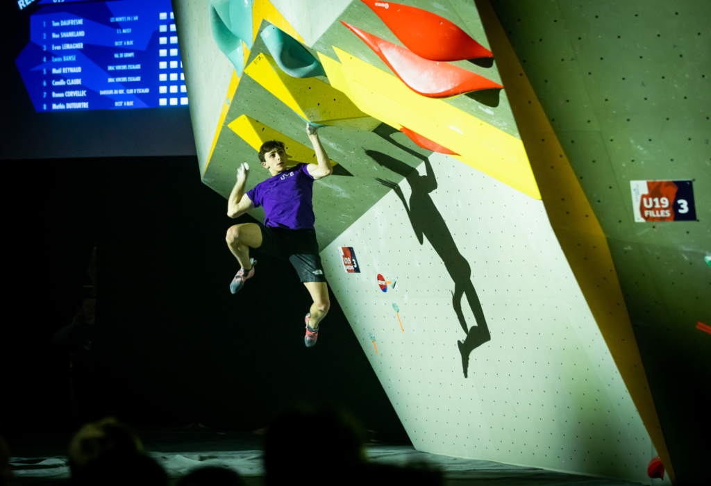 Chez les garçons, le top 4 est départagé sur 0,6 points ! Autant vous dire que la bagarre était haletante ! Ils seront donc quatre à toper deux blocs + deux zones, et les essais auront été déterminants. À ce jeu, Tom Daufresne prend le titre de Champion de France de bloc U19 avec un score de 69,8 points (sur les 70 possibles avec 2 blocs + 2 zones). Maël Reynaud est dans la course, et décroche la médaille d’argent avec un score de 69,6 points ! Enfin, Noé Shankland prend le bronze avec 69,4 points … et pourtant, ce dernier avait réalisé le meilleur départ en étant le seul à toper le bloc 1, mais il ne parviendra ensuite à toper que la coordo du dernier bloc.