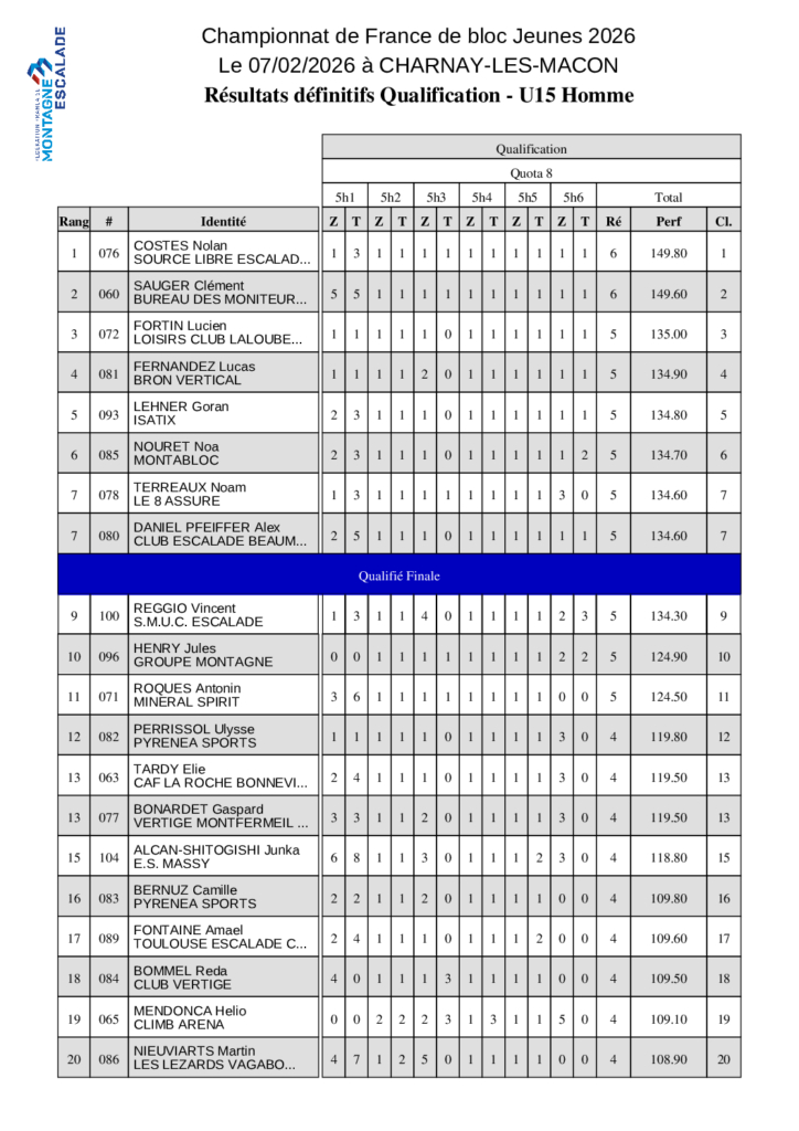 Championnat de France de bloc Jeunes 2026 – Qualification U15 HOMME