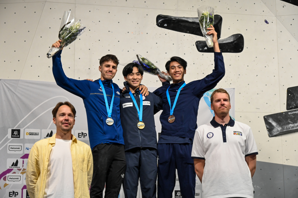 Du côté des U19 hommes, l’un des favoris n’était autre que notre Français Sam Richard. Il serait hélas tombé sur plus fort que lui en finale, et pourtant le circuit était bien entamé pour Sam: les deux premiers blocs tombent au premier essai, puis le 3ème top en 3 essais. Il ne parviendra pas à faire un sans faute et se contentera de la zone sur le dernier bloc. Le Japonais Kodai Yamada sera quant à lui le seul à valider les 4 blocs proposés en finale. Il prend alors le titre de champion monde jeunes en bloc chez les U19, et laisse l’argent à Sam Richard.