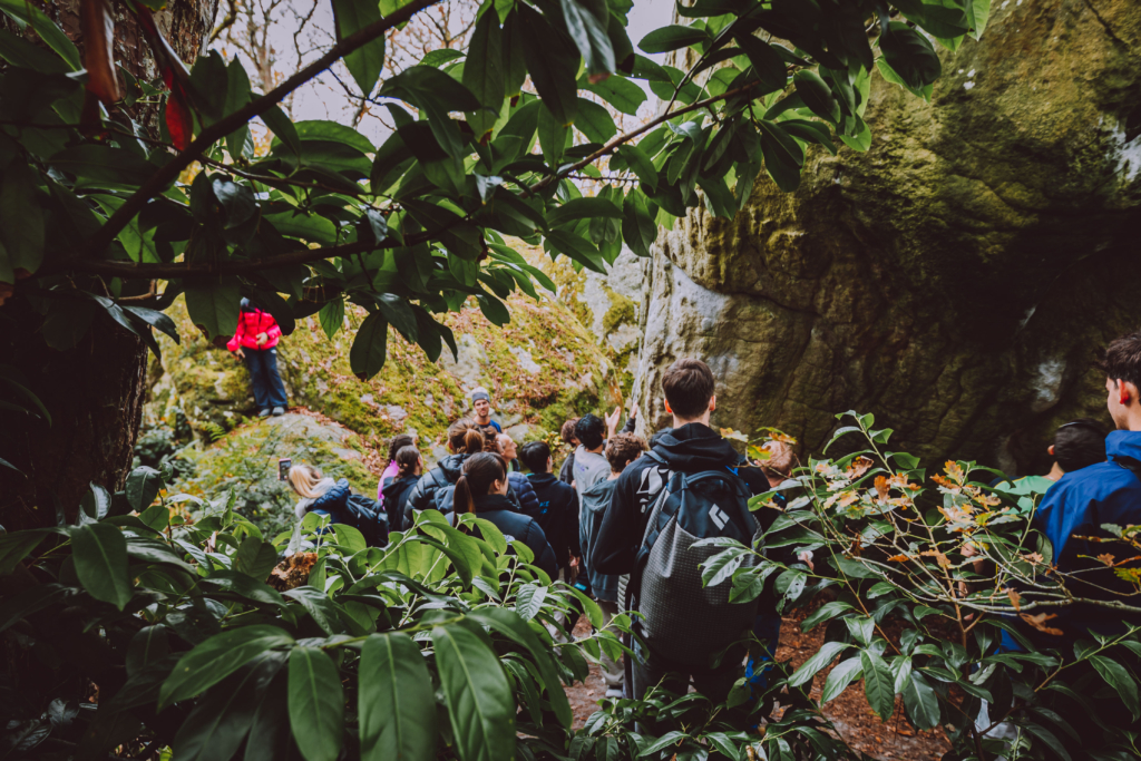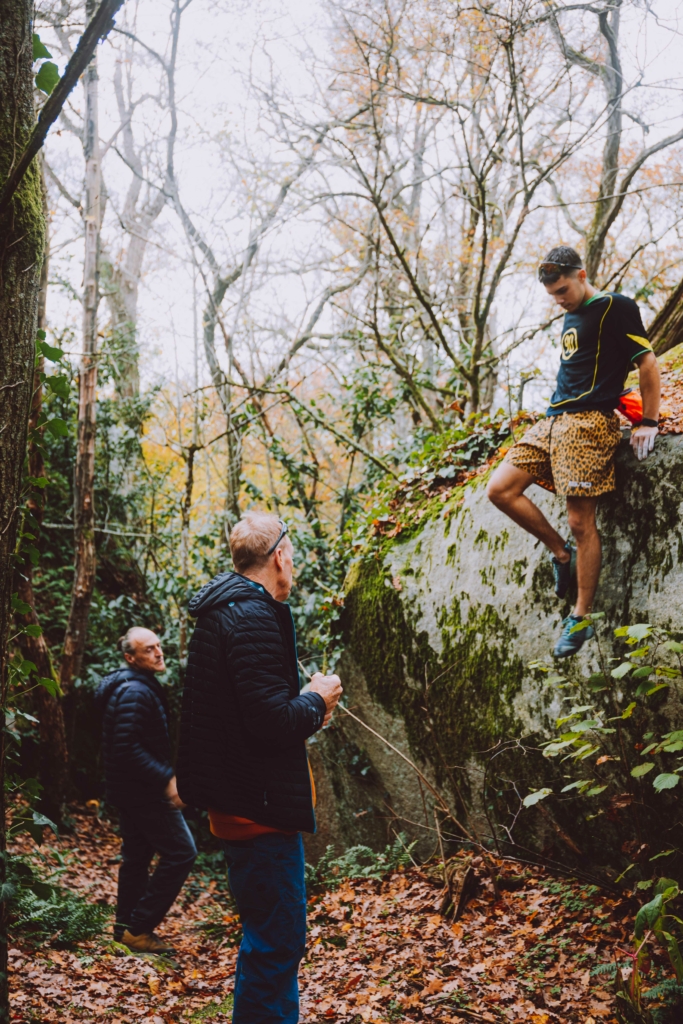 À leurs côtés, un guide pas comme les autres : Jacky Godoffe. Dans ce lieu mythique où s’est écrite une grande partie de l’histoire du bloc, sa présence résonne tout particulièrement. Premier grimpeur à libérer le 8A bloc à Bleau en 1984 avec « C’était Demain », puis deuxième (à quelques jour près) à repousser les limites au 8B en 1994 avec « Fat Man ».