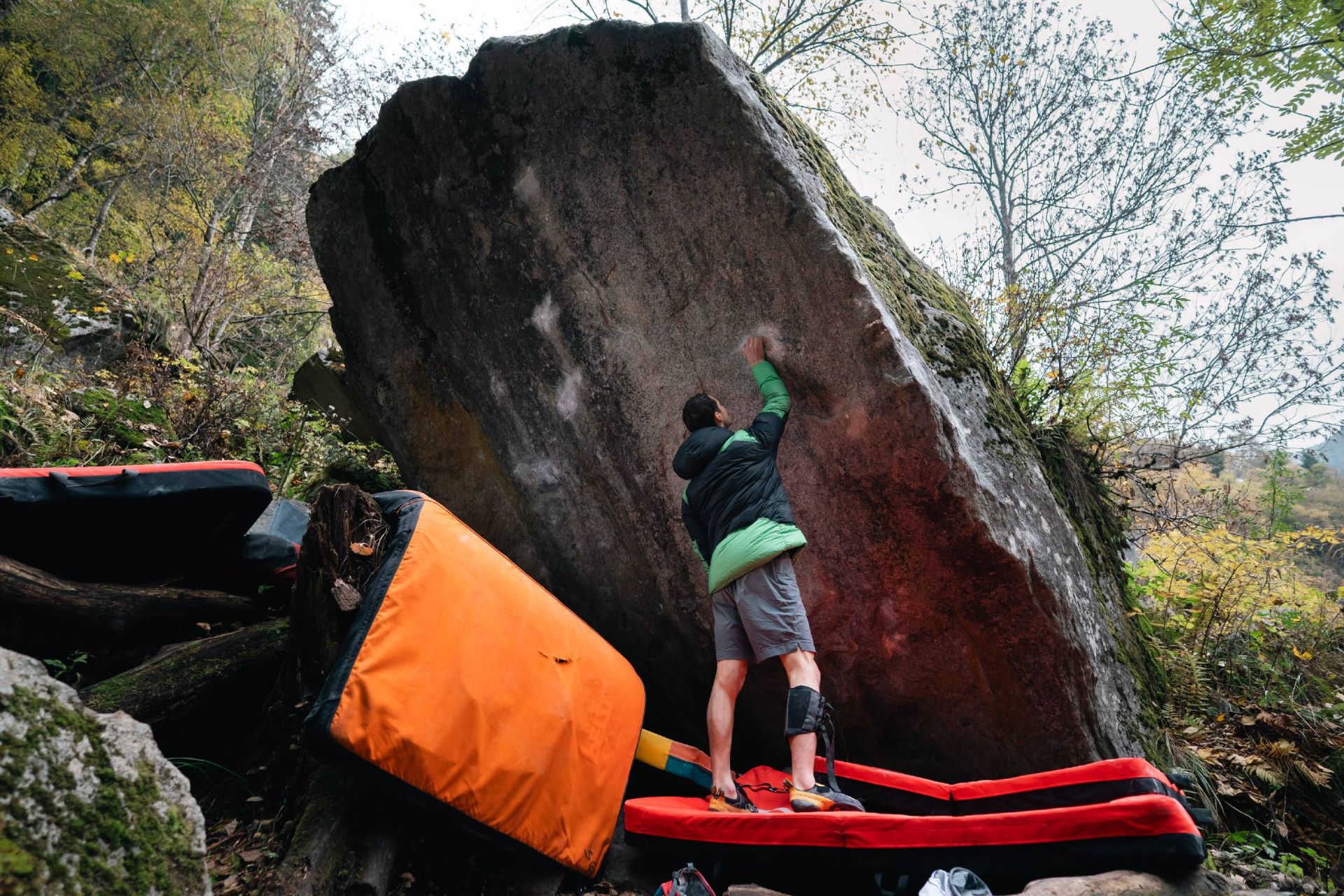 Est-il alors acceptable d’utiliser un seul crash pad pour y parvenir ? Et de quelle épaisseur ? De plus, cette logique finirait par limiter les tentatives flashs aux blocs plutôt courts, où l’on peut facilement toucher toutes les prises depuis le sol. Résultat : une inégalité implicite entre grimpeurs… et entre styles.