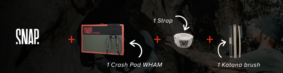 - Crash Pad WHAM : conçu pour les grimpeurs à la recherche de robustesse et de performance. Fabriqué à partir de matériaux 100 % recyclables, avec un revêtement en polyester et TPU pour une durabilité accrue. Son design monobloc sans pli central, associé à la technologie Air exclusive de SNAP, garantit un amorti optimal quelle que soit la hauteur. Composé de deux mousses haute densité — EVA de 20 mm pour réduire les chocs et polyuréthane de 12 cm pour absorber les impacts — le Wham offre une protection maximale. Les sangles amovibles se rangent discrètement dans une poche intégrée, et un paillasson double face est également inclus pour garder vos chaussons propres. Une ceinture ventrale peut être ajoutée pour un transport encore plus confortable