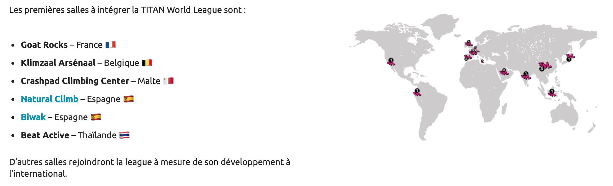 Depuis les Jeux Olympiques, une vingtaine de murs TITAN (tous strictement identiques en forme et dimensions) ont déjà été construits à travers le monde. Ce 15 janvier marque le lancement officiel de la TITAN World League : une compétition ouverte à tous, qui se déroulera simultanément dans plusieurs salles équipées du mur, en France, en Belgique, en Espagne, en Thaïlande ou encore à Malte.