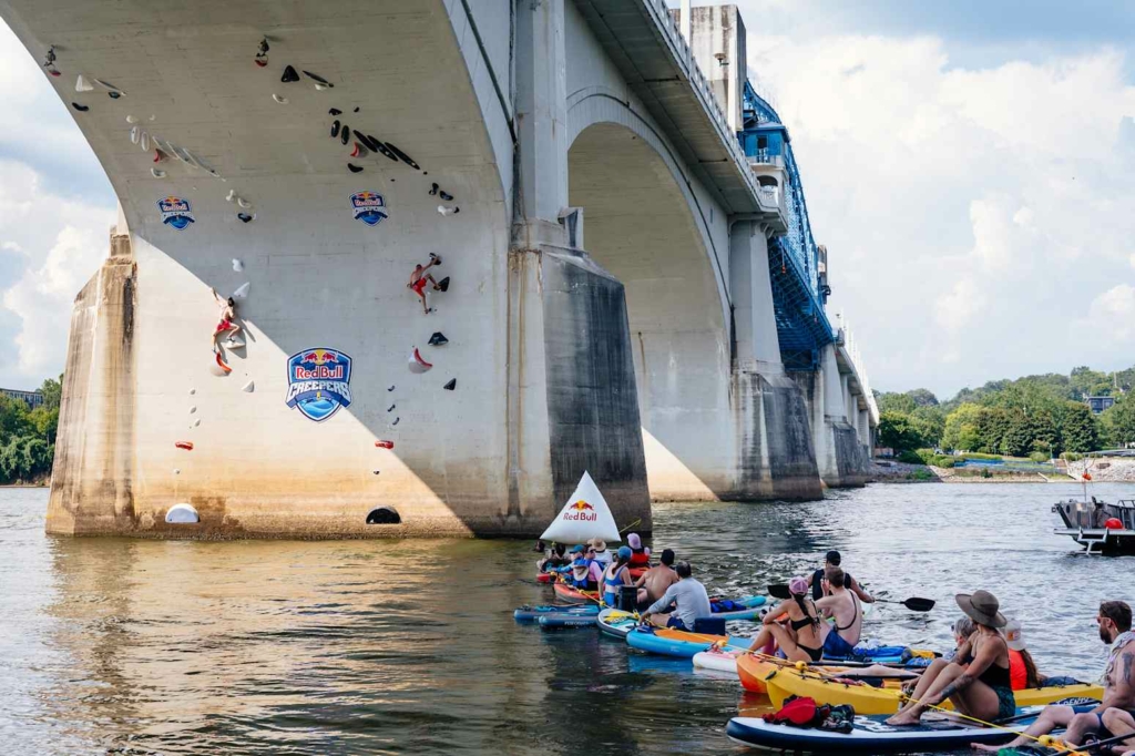 Après deux éditions espagnoles marquées par des shows mémorables (dont celle de 2021 remportée par les frères et sœurs Kruder), la compétition a traversé l’Atlantique pour poser ses prises à Chattanooga, l’une des capitales de l’outdoor aux États-Unis. Pour l’occasion, le célèbre Market Street Bridge s’est transformé en mur d’escalade de 20 mètres, offrant un décor unique au-dessus de la rivière Tennessee.
