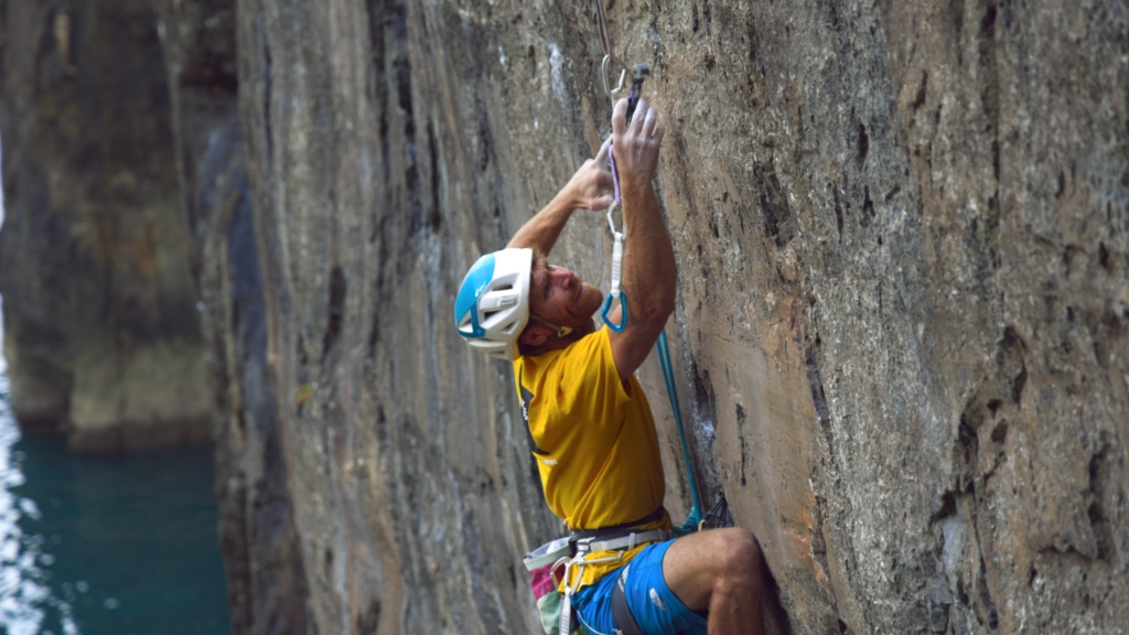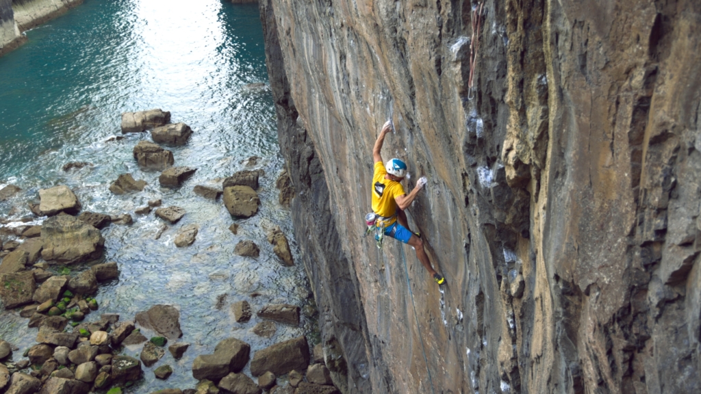 Ouverte en 2010 par Tim Emmett, « Muy Caliente » avait été initialement proposée à E10 7a. Avec ses 35 mètres d’escalade exigeante, son style résolument bloc, et surtout un engagement total (parfois l’espace entre les protections dépassent les 10 mètres !), la voie impose autant par son niveau technique (estimé autour de 8a+/8b) que par son engagement. Au fil des répétitions, la cotation s’est stabilisée à E9 6c, mais la réputation de la ligne n’en a pas été diminuée pour autant.