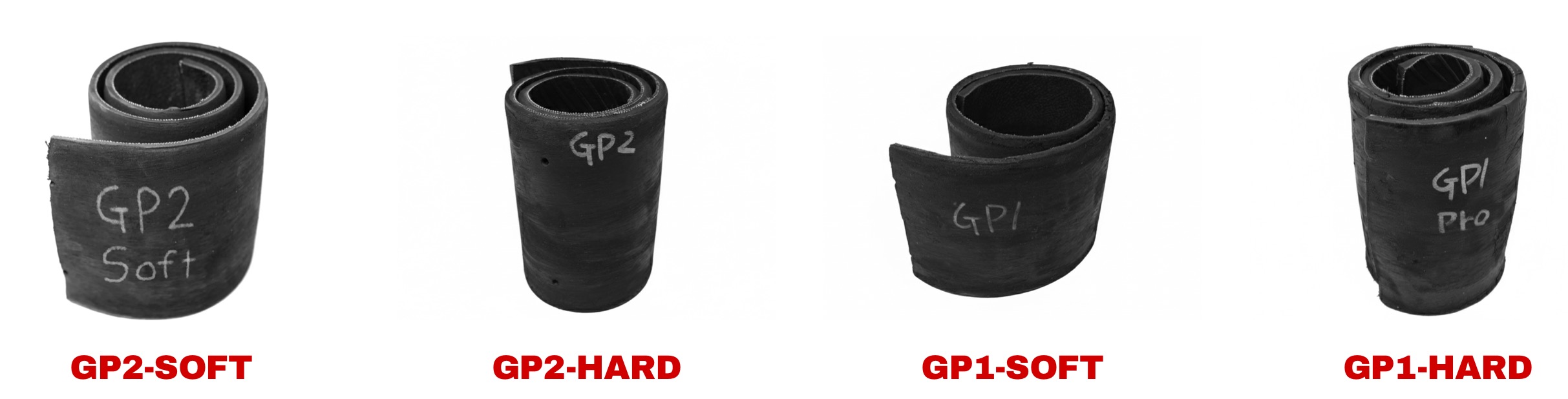 - GP1-Soft : la gomme la plus souple et la plus adhérente de la gamme, conçue pour se déformer et « épouser » les moindres aspérités de la surface.