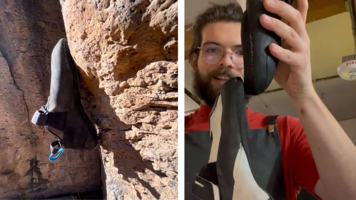 Un chausson collé au rocher. Littéralement collé. C’est la vidéo qui a mis le feu aux poudres. Publiée par Rhythm Resole, un ressemeleur américain, elle montre un chausson équipé d’une gomme inconnue, collé contre un rocher. Et il ne bouge pas. Pas d’un millimètre ! La scène a dépassé 1,5 million de vues, choqué des milliers de grimpeurs, et lancé une tempête de débats.